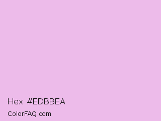 Hex #edbbea Color is a very light magenta color and the nearest color is French Lilac #ecc7ee. Hex code #edbbea and RGB value is rgb(237,187,234). In RGB color space, this color is composed of 93% red, 73% green, 92% blue, In CMYK color space, this color is composed of 0% cyan, 21% magenta, 1% yellow , 7% black , In HSL color space, this color has a hue angle of 304° , 58% saturation and 83% lightness.