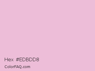 Hex #edbdd8 Color is a very light magenta color and the nearest color is Melanie #e4c2d5. Hex code #edbdd8 and RGB value is rgb(237,189,216). In RGB color space, this color is composed of 93% red, 74% green, 85% blue, In CMYK color space, this color is composed of 0% cyan, 20% magenta, 9% yellow , 7% black , In HSL color space, this color has a hue angle of 326° , 57% saturation and 84% lightness.