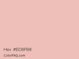Hex #edbfb8 Color is a very light red color and the nearest color is Beauty Bush #eec1be. Hex code #edbfb8 and RGB value is rgb(237,191,184). In RGB color space, this color is composed of 93% red, 75% green, 72% blue, In CMYK color space, this color is composed of 0% cyan, 19% magenta, 22% yellow , 7% black , In HSL color space, this color has a hue angle of 8° , 60% saturation and 83% lightness.