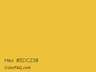 Hex #edc238 Color is a normal yellow color and the nearest color is Saffron #f4c430. Hex code #edc238 and RGB value is rgb(237,194,56). In RGB color space, this color is composed of 93% red, 76% green, 22% blue, In CMYK color space, this color is composed of 0% cyan, 18% magenta, 76% yellow , 7% black , In HSL color space, this color has a hue angle of 46° , 83% saturation and 57% lightness.