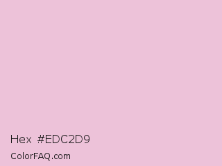 Hex #edc2d9 Color is a very light rose color and the nearest color is Melanie #e4c2d5. Hex code #edc2d9 and RGB value is rgb(237,194,217). In RGB color space, this color is composed of 93% red, 76% green, 85% blue, In CMYK color space, this color is composed of 0% cyan, 18% magenta, 8% yellow , 7% black , In HSL color space, this color has a hue angle of 328° , 54% saturation and 85% lightness.