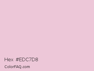 Hex #edc7d8 Color is a very light rose color and the nearest color is Queen Pink #e8ccd7. Hex code #edc7d8 and RGB value is rgb(237,199,216). In RGB color space, this color is composed of 93% red, 78% green, 85% blue, In CMYK color space, this color is composed of 0% cyan, 16% magenta, 9% yellow , 7% black , In HSL color space, this color has a hue angle of 333° , 51% saturation and 85% lightness.