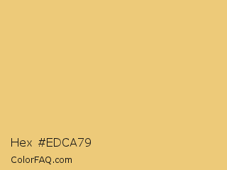 Hex #edca79 Color is a light orange color and the nearest color is Rob Roy #eac674. Hex code #edca79 and RGB value is rgb(237,202,121). In RGB color space, this color is composed of 93% red, 79% green, 47% blue, In CMYK color space, this color is composed of 0% cyan, 15% magenta, 49% yellow , 7% black , In HSL color space, this color has a hue angle of 42° , 76% saturation and 70% lightness.