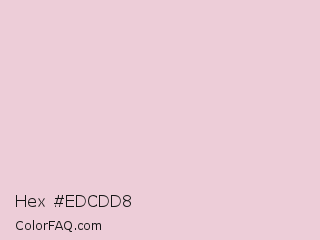 Hex #edcdd8 Color is a very light rose color and the nearest color is Queen Pink #e8ccd7. Hex code #edcdd8 and RGB value is rgb(237,205,216). In RGB color space, this color is composed of 93% red, 80% green, 85% blue, In CMYK color space, this color is composed of 0% cyan, 14% magenta, 9% yellow , 7% black , In HSL color space, this color has a hue angle of 339° , 47% saturation and 87% lightness.