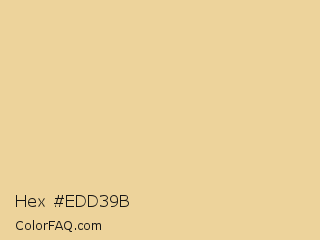 Hex #edd39b Color is a light orange color and the nearest color is New Orleans #f3d69d. Hex code #edd39b and RGB value is rgb(237,211,155). In RGB color space, this color is composed of 93% red, 83% green, 61% blue, In CMYK color space, this color is composed of 0% cyan, 11% magenta, 35% yellow , 7% black , In HSL color space, this color has a hue angle of 41° , 69% saturation and 77% lightness.