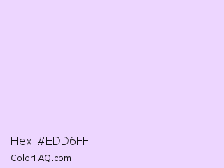 Hex #edd6ff Color is a very light purple color and the nearest color is Pale Lavender #dcd0ff. Hex code #edd6ff and RGB value is rgb(237,214,255). In RGB color space, this color is composed of 93% red, 84% green, 100% blue, In CMYK color space, this color is composed of 7% cyan, 16% magenta, 0% yellow , 0% black , In HSL color space, this color has a hue angle of 274° , 100% saturation and 92% lightness.