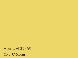 Hex #edd769 Color is a light yellow color and the nearest color is Hansa Yellow #e9d66b. Hex code #edd769 and RGB value is rgb(237,215,105). In RGB color space, this color is composed of 93% red, 84% green, 41% blue, In CMYK color space, this color is composed of 0% cyan, 9% magenta, 56% yellow , 7% black , In HSL color space, this color has a hue angle of 50° , 79% saturation and 67% lightness.