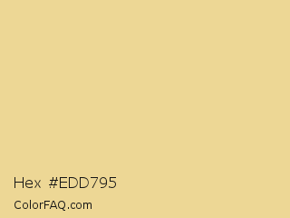 Hex #edd795 Color is a light orange color and the nearest color is Chalky #eed794. Hex code #edd795 and RGB value is rgb(237,215,149). In RGB color space, this color is composed of 93% red, 84% green, 58% blue, In CMYK color space, this color is composed of 0% cyan, 9% magenta, 37% yellow , 7% black , In HSL color space, this color has a hue angle of 45° , 71% saturation and 76% lightness.