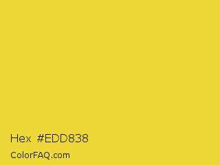 Hex #edd838 Color is a normal yellow color and the nearest color is Sandstorm #ecd540. Hex code #edd838 and RGB value is rgb(237,216,56). In RGB color space, this color is composed of 93% red, 85% green, 22% blue, In CMYK color space, this color is composed of 0% cyan, 9% magenta, 76% yellow , 7% black , In HSL color space, this color has a hue angle of 53° , 83% saturation and 57% lightness.