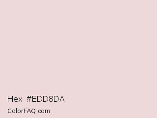 Hex #edd8da Color is a very light red color and the nearest color is Bizarre #eededa. Hex code #edd8da and RGB value is rgb(237,216,218). In RGB color space, this color is composed of 93% red, 85% green, 85% blue, In CMYK color space, this color is composed of 0% cyan, 9% magenta, 8% yellow , 7% black , In HSL color space, this color has a hue angle of 354° , 37% saturation and 89% lightness.