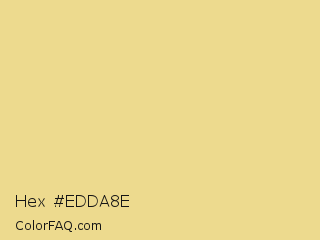 Hex #edda8e Color is a light yellow color and the nearest color is Wild Rice #ece090. Hex code #edda8e and RGB value is rgb(237,218,142). In RGB color space, this color is composed of 93% red, 85% green, 56% blue, In CMYK color space, this color is composed of 0% cyan, 8% magenta, 40% yellow , 7% black , In HSL color space, this color has a hue angle of 48° , 73% saturation and 74% lightness.