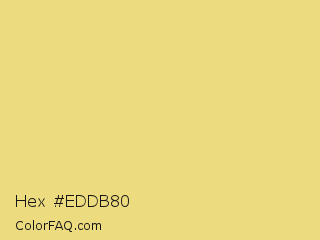 Hex #eddb80 Color is a light yellow color and the nearest color is Flax #eedc82. Hex code #eddb80 and RGB value is rgb(237,219,128). In RGB color space, this color is composed of 93% red, 86% green, 50% blue, In CMYK color space, this color is composed of 0% cyan, 8% magenta, 46% yellow , 7% black , In HSL color space, this color has a hue angle of 50° , 75% saturation and 72% lightness.