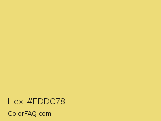 Hex #eddc78 Color is a light yellow color and the nearest color is Golden Sand #f0db7d. Hex code #eddc78 and RGB value is rgb(237,220,120). In RGB color space, this color is composed of 93% red, 86% green, 47% blue, In CMYK color space, this color is composed of 0% cyan, 7% magenta, 49% yellow , 7% black , In HSL color space, this color has a hue angle of 51° , 76% saturation and 70% lightness.