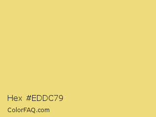Hex #eddc79 Color is a light yellow color and the nearest color is Golden Sand #f0db7d. Hex code #eddc79 and RGB value is rgb(237,220,121). In RGB color space, this color is composed of 93% red, 86% green, 47% blue, In CMYK color space, this color is composed of 0% cyan, 7% magenta, 49% yellow , 7% black , In HSL color space, this color has a hue angle of 51° , 76% saturation and 70% lightness.