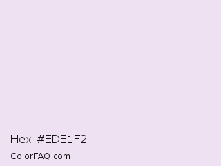 Hex #ede1f2 Color is a very light purple color and the nearest color is Prim #f0e2ec. Hex code #ede1f2 and RGB value is rgb(237,225,242). In RGB color space, this color is composed of 93% red, 88% green, 95% blue, In CMYK color space, this color is composed of 2% cyan, 7% magenta, 0% yellow , 5% black , In HSL color space, this color has a hue angle of 282° , 40% saturation and 92% lightness.