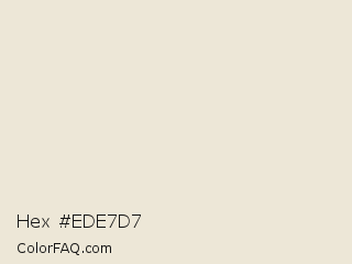 Hex #ede7d7 Color is a very light orange color and the nearest color is Eggshell #f0ead6. Hex code #ede7d7 and RGB value is rgb(237,231,215). In RGB color space, this color is composed of 93% red, 91% green, 84% blue, In CMYK color space, this color is composed of 0% cyan, 3% magenta, 9% yellow , 7% black , In HSL color space, this color has a hue angle of 44° , 38% saturation and 89% lightness.