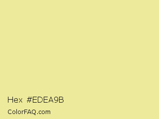 Hex #edea9b Color is a light yellow color and the nearest color is Primrose #edea99. Hex code #edea9b and RGB value is rgb(237,234,155). In RGB color space, this color is composed of 93% red, 92% green, 61% blue, In CMYK color space, this color is composed of 0% cyan, 1% magenta, 35% yellow , 7% black , In HSL color space, this color has a hue angle of 58° , 69% saturation and 77% lightness.
