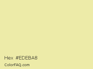 Hex #edeba8 Color is a light yellow color and the nearest color is Pale Goldenrod #eee8aa. Hex code #edeba8 and RGB value is rgb(237,235,168). In RGB color space, this color is composed of 93% red, 92% green, 66% blue, In CMYK color space, this color is composed of 0% cyan, 1% magenta, 29% yellow , 7% black , In HSL color space, this color has a hue angle of 58° , 66% saturation and 79% lightness.