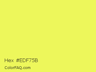 Hex #edf75b Color is a light yellow color and the nearest color is Canary #f3fb62. Hex code #edf75b and RGB value is rgb(237,247,91). In RGB color space, this color is composed of 93% red, 97% green, 36% blue, In CMYK color space, this color is composed of 4% cyan, 0% magenta, 63% yellow , 3% black , In HSL color space, this color has a hue angle of 64° , 91% saturation and 66% lightness.