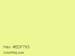 Hex #edf793 Color is a light yellow color and the nearest color is Key Lime #e8f48c. Hex code #edf793 and RGB value is rgb(237,247,147). In RGB color space, this color is composed of 93% red, 97% green, 58% blue, In CMYK color space, this color is composed of 4% cyan, 0% magenta, 40% yellow , 3% black , In HSL color space, this color has a hue angle of 66° , 86% saturation and 77% lightness.