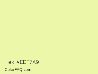 Hex #edf7a9 Color is a very light yellow color and the nearest color is Tidal #f1ffad. Hex code #edf7a9 and RGB value is rgb(237,247,169). In RGB color space, this color is composed of 93% red, 97% green, 66% blue, In CMYK color space, this color is composed of 4% cyan, 0% magenta, 32% yellow , 3% black , In HSL color space, this color has a hue angle of 68° , 83% saturation and 82% lightness.