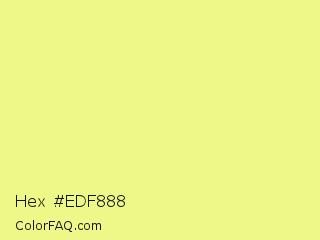Hex #edf888 Color is a light yellow color and the nearest color is Honeysuckle #edfc84. Hex code #edf888 and RGB value is rgb(237,248,136). In RGB color space, this color is composed of 93% red, 97% green, 53% blue, In CMYK color space, this color is composed of 4% cyan, 0% magenta, 45% yellow , 3% black , In HSL color space, this color has a hue angle of 66° , 89% saturation and 75% lightness.
