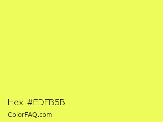 Hex #edfb5b Color is a light yellow color and the nearest color is Canary #f3fb62. Hex code #edfb5b and RGB value is rgb(237,251,91). In RGB color space, this color is composed of 93% red, 98% green, 36% blue, In CMYK color space, this color is composed of 6% cyan, 0% magenta, 64% yellow , 2% black , In HSL color space, this color has a hue angle of 65° , 95% saturation and 67% lightness.