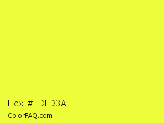 Hex #edfd3a Color is a light yellow color and the nearest color is Golden Fizz #f5fb3d. Hex code #edfd3a and RGB value is rgb(237,253,58). In RGB color space, this color is composed of 93% red, 99% green, 23% blue, In CMYK color space, this color is composed of 6% cyan, 0% magenta, 77% yellow , 1% black , In HSL color space, this color has a hue angle of 65° , 98% saturation and 61% lightness.
