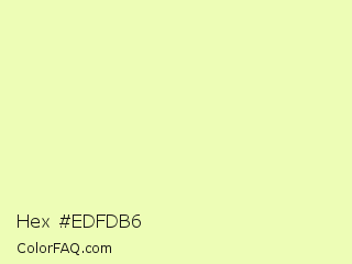 Hex #edfdb6 Color is a very light lime color and the nearest color is Tidal #f1ffad. Hex code #edfdb6 and RGB value is rgb(237,253,182). In RGB color space, this color is composed of 93% red, 99% green, 71% blue, In CMYK color space, this color is composed of 6% cyan, 0% magenta, 28% yellow , 1% black , In HSL color space, this color has a hue angle of 74° , 95% saturation and 85% lightness.