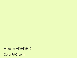 Hex #edfdbd Color is a very light lime color and the nearest color is Australian Mint #f5ffbe. Hex code #edfdbd and RGB value is rgb(237,253,189). In RGB color space, this color is composed of 93% red, 99% green, 74% blue, In CMYK color space, this color is composed of 6% cyan, 0% magenta, 25% yellow , 1% black , In HSL color space, this color has a hue angle of 75° , 94% saturation and 87% lightness.