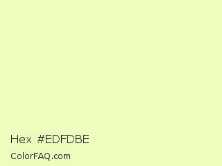 Hex #edfdbe Color is a very light lime color and the nearest color is Australian Mint #f5ffbe. Hex code #edfdbe and RGB value is rgb(237,253,190). In RGB color space, this color is composed of 93% red, 99% green, 75% blue, In CMYK color space, this color is composed of 6% cyan, 0% magenta, 25% yellow , 1% black , In HSL color space, this color has a hue angle of 75° , 94% saturation and 87% lightness.