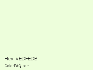 Hex #edfedb Color is a very light green color and the nearest color is Nyanza #e9ffdb. Hex code #edfedb and RGB value is rgb(237,254,219). In RGB color space, this color is composed of 93% red, 100% green, 86% blue, In CMYK color space, this color is composed of 7% cyan, 0% magenta, 14% yellow , 0% black , In HSL color space, this color has a hue angle of 89° , 95% saturation and 93% lightness.