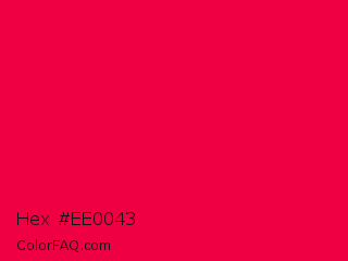 Hex #ee0043 Color is a normal rose color and the nearest color is Red Munsell #f2003c. Hex code #ee0043 and RGB value is rgb(238,0,67). In RGB color space, this color is composed of 93% red, 0% green, 26% blue, In CMYK color space, this color is composed of 0% cyan, 100% magenta, 72% yellow , 7% black , In HSL color space, this color has a hue angle of 343° , 100% saturation and 47% lightness.