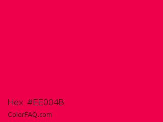Hex #ee004b Color is a normal rose color and the nearest color is Red Munsell #f2003c. Hex code #ee004b and RGB value is rgb(238,0,75). In RGB color space, this color is composed of 93% red, 0% green, 29% blue, In CMYK color space, this color is composed of 0% cyan, 100% magenta, 68% yellow , 7% black , In HSL color space, this color has a hue angle of 341° , 100% saturation and 47% lightness.