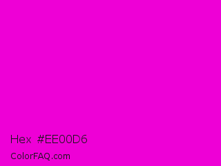 Hex #ee00d6 Color is a normal magenta color and the nearest color is Purple Pizzazz #ff00cc. Hex code #ee00d6 and RGB value is rgb(238,0,214). In RGB color space, this color is composed of 93% red, 0% green, 84% blue, In CMYK color space, this color is composed of 0% cyan, 100% magenta, 10% yellow , 7% black , In HSL color space, this color has a hue angle of 306° , 100% saturation and 47% lightness.