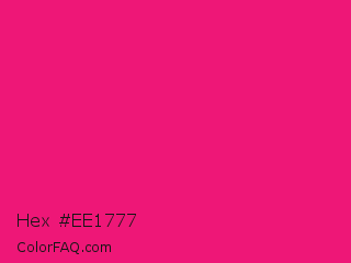 Hex #ee1777 Color is a normal rose color and the nearest color is Razzmatazz #e3256b. Hex code #ee1777 and RGB value is rgb(238,23,119). In RGB color space, this color is composed of 93% red, 9% green, 47% blue, In CMYK color space, this color is composed of 0% cyan, 90% magenta, 50% yellow , 7% black , In HSL color space, this color has a hue angle of 333° , 86% saturation and 51% lightness.
