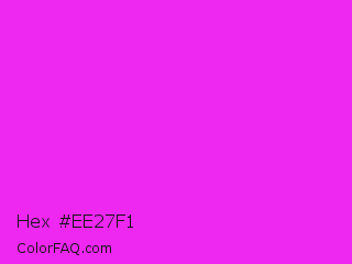 Hex #ee27f1 Color is a normal magenta color and the nearest color is Hot Magenta #ff1dce. Hex code #ee27f1 and RGB value is rgb(238,39,241). In RGB color space, this color is composed of 93% red, 15% green, 95% blue, In CMYK color space, this color is composed of 1% cyan, 84% magenta, 0% yellow , 5% black , In HSL color space, this color has a hue angle of 299° , 88% saturation and 55% lightness.