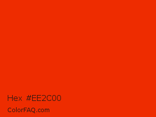Hex #ee2c00 Color is a normal red color and the nearest color is Ferrari Red #ff2800. Hex code #ee2c00 and RGB value is rgb(238,44,0). In RGB color space, this color is composed of 93% red, 17% green, 0% blue, In CMYK color space, this color is composed of 0% cyan, 82% magenta, 100% yellow , 7% black , In HSL color space, this color has a hue angle of 11° , 100% saturation and 47% lightness.