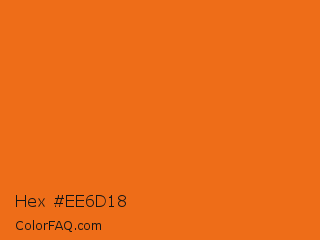 Hex #ee6d18 Color is a normal orange color and the nearest color is Tango #ed7a1c. Hex code #ee6d18 and RGB value is rgb(238,109,24). In RGB color space, this color is composed of 93% red, 43% green, 9% blue, In CMYK color space, this color is composed of 0% cyan, 54% magenta, 90% yellow , 7% black , In HSL color space, this color has a hue angle of 24° , 86% saturation and 51% lightness.