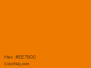 Hex #ee7b00 Color is a normal orange color and the nearest color is Gold Drop #f18200. Hex code #ee7b00 and RGB value is rgb(238,123,0). In RGB color space, this color is composed of 93% red, 48% green, 0% blue, In CMYK color space, this color is composed of 0% cyan, 48% magenta, 100% yellow , 7% black , In HSL color space, this color has a hue angle of 31° , 100% saturation and 47% lightness.