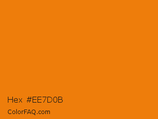 Hex #ee7d0b Color is a normal orange color and the nearest color is Tahiti Gold #e97c07. Hex code #ee7d0b and RGB value is rgb(238,125,11). In RGB color space, this color is composed of 93% red, 49% green, 4% blue, In CMYK color space, this color is composed of 0% cyan, 47% magenta, 95% yellow , 7% black , In HSL color space, this color has a hue angle of 30° , 91% saturation and 49% lightness.
