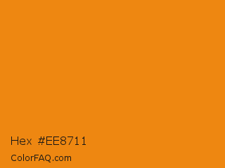 Hex #ee8711 Color is a normal orange color and the nearest color is Golden Bell #e28913. Hex code #ee8711 and RGB value is rgb(238,135,17). In RGB color space, this color is composed of 93% red, 53% green, 7% blue, In CMYK color space, this color is composed of 0% cyan, 43% magenta, 93% yellow , 7% black , In HSL color space, this color has a hue angle of 32° , 87% saturation and 50% lightness.