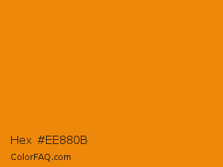 Hex #ee880b Color is a normal orange color and the nearest color is Tangerine #f28500. Hex code #ee880b and RGB value is rgb(238,136,11). In RGB color space, this color is composed of 93% red, 53% green, 4% blue, In CMYK color space, this color is composed of 0% cyan, 43% magenta, 95% yellow , 7% black , In HSL color space, this color has a hue angle of 33° , 91% saturation and 49% lightness.