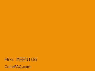 Hex #ee9106 Color is a normal orange color and the nearest color is Tangerine #f28500. Hex code #ee9106 and RGB value is rgb(238,145,6). In RGB color space, this color is composed of 93% red, 57% green, 2% blue, In CMYK color space, this color is composed of 0% cyan, 39% magenta, 97% yellow , 7% black , In HSL color space, this color has a hue angle of 36° , 95% saturation and 48% lightness.