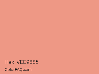 Hex #ee9885 Color is a light red color and the nearest color is Tonys Pink #e79f8c. Hex code #ee9885 and RGB value is rgb(238,152,133). In RGB color space, this color is composed of 93% red, 60% green, 52% blue, In CMYK color space, this color is composed of 0% cyan, 36% magenta, 44% yellow , 7% black , In HSL color space, this color has a hue angle of 11° , 76% saturation and 73% lightness.
