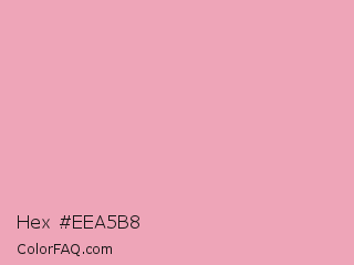 Hex #eea5b8 Color is a light rose color and the nearest color is Amaranth Pink #f19cbb. Hex code #eea5b8 and RGB value is rgb(238,165,184). In RGB color space, this color is composed of 93% red, 65% green, 72% blue, In CMYK color space, this color is composed of 0% cyan, 31% magenta, 23% yellow , 7% black , In HSL color space, this color has a hue angle of 344° , 68% saturation and 79% lightness.