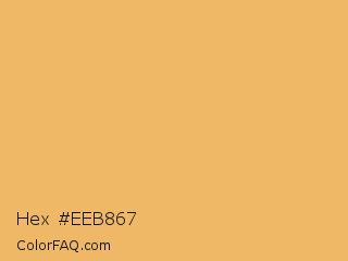 Hex #eeb867 Color is a light orange color and the nearest color is Rajah #f7b668. Hex code #eeb867 and RGB value is rgb(238,184,103). In RGB color space, this color is composed of 93% red, 72% green, 40% blue, In CMYK color space, this color is composed of 0% cyan, 23% magenta, 57% yellow , 7% black , In HSL color space, this color has a hue angle of 36° , 80% saturation and 67% lightness.