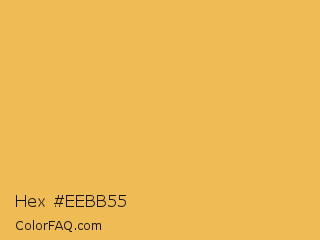 Hex #eebb55 Color is a light orange color and the nearest color is Casablanca #f8b853. Hex code #eebb55 and RGB value is rgb(238,187,85). In RGB color space, this color is composed of 93% red, 73% green, 33% blue, In CMYK color space, this color is composed of 0% cyan, 21% magenta, 64% yellow , 7% black , In HSL color space, this color has a hue angle of 40° , 82% saturation and 63% lightness.