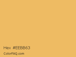 Hex #eebb63 Color is a light orange color and the nearest color is Rajah #f7b668. Hex code #eebb63 and RGB value is rgb(238,187,99). In RGB color space, this color is composed of 93% red, 73% green, 39% blue, In CMYK color space, this color is composed of 0% cyan, 21% magenta, 58% yellow , 7% black , In HSL color space, this color has a hue angle of 38° , 80% saturation and 66% lightness.