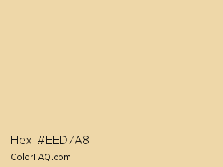 Hex #eed7a8 Color is a light orange color and the nearest color is Chamois #eddcb1. Hex code #eed7a8 and RGB value is rgb(238,215,168). In RGB color space, this color is composed of 93% red, 84% green, 66% blue, In CMYK color space, this color is composed of 0% cyan, 10% magenta, 29% yellow , 7% black , In HSL color space, this color has a hue angle of 40° , 67% saturation and 80% lightness.